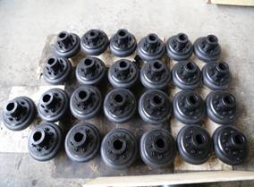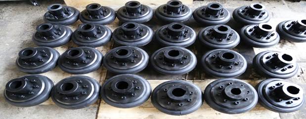 輪胎聯(lián)軸器分為凸型輪胎聯(lián)軸器和凹型輪胎聯(lián)軸器兩大類,凸型輪胎聯(lián)軸器又分為帶骨架整體式輪胎聯(lián)軸器、無骨整體式輪胎聯(lián)軸器和徑向切口式輪胎聯(lián)軸器三種。輪胎環(huán)內(nèi)側(cè)用硫化方法與鋼質(zhì)骨架粘接成一體,骨架上的螺栓孔處焊有螺母。