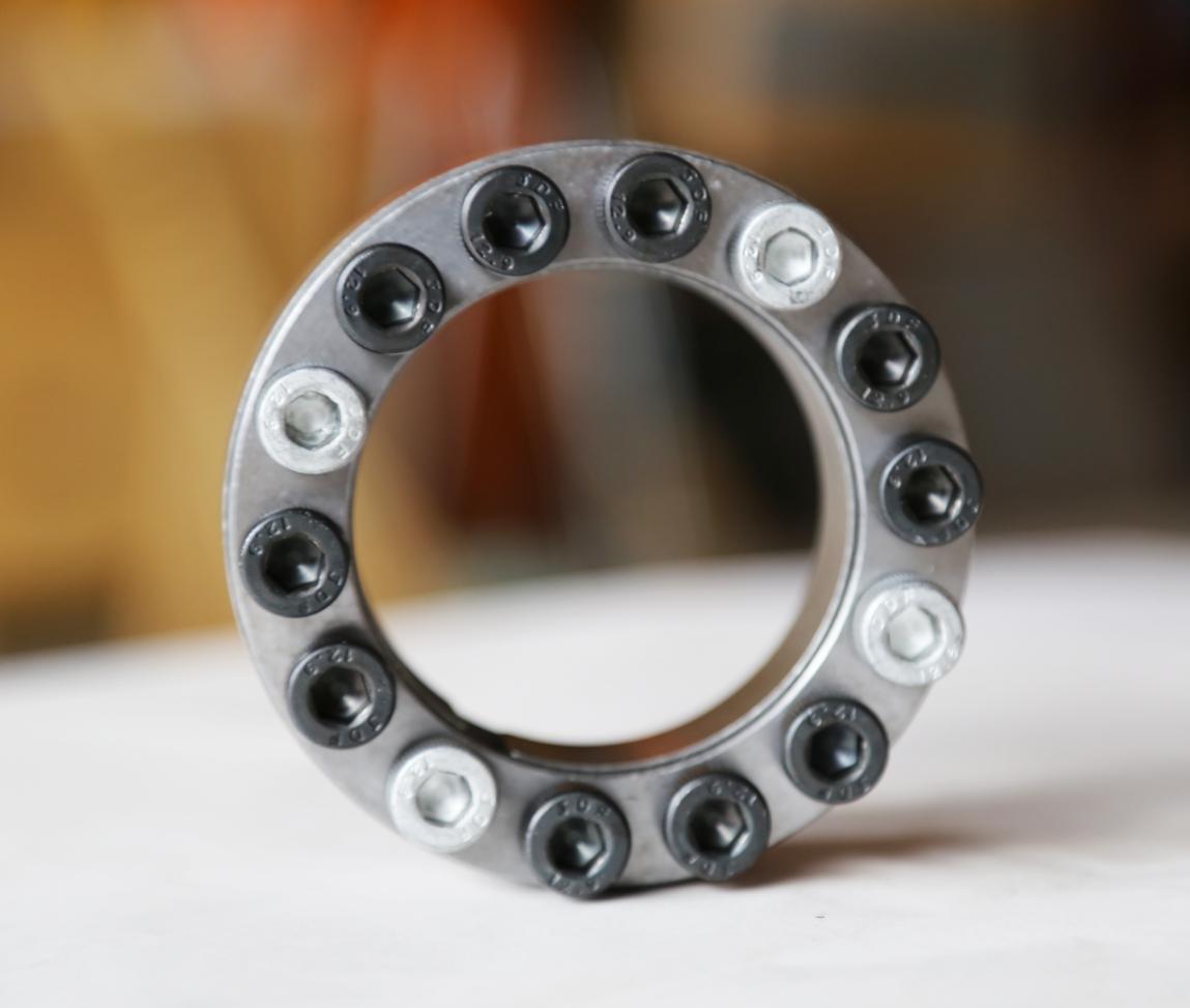 3. 取下頂出的鍍鋅螺釘,將頂出螺釘旋入前壓環(huán)的輔助螺孔中,輕輕敲擊被脹緊的傳動件, 使其脹環(huán)松動,即可將脹套拉出